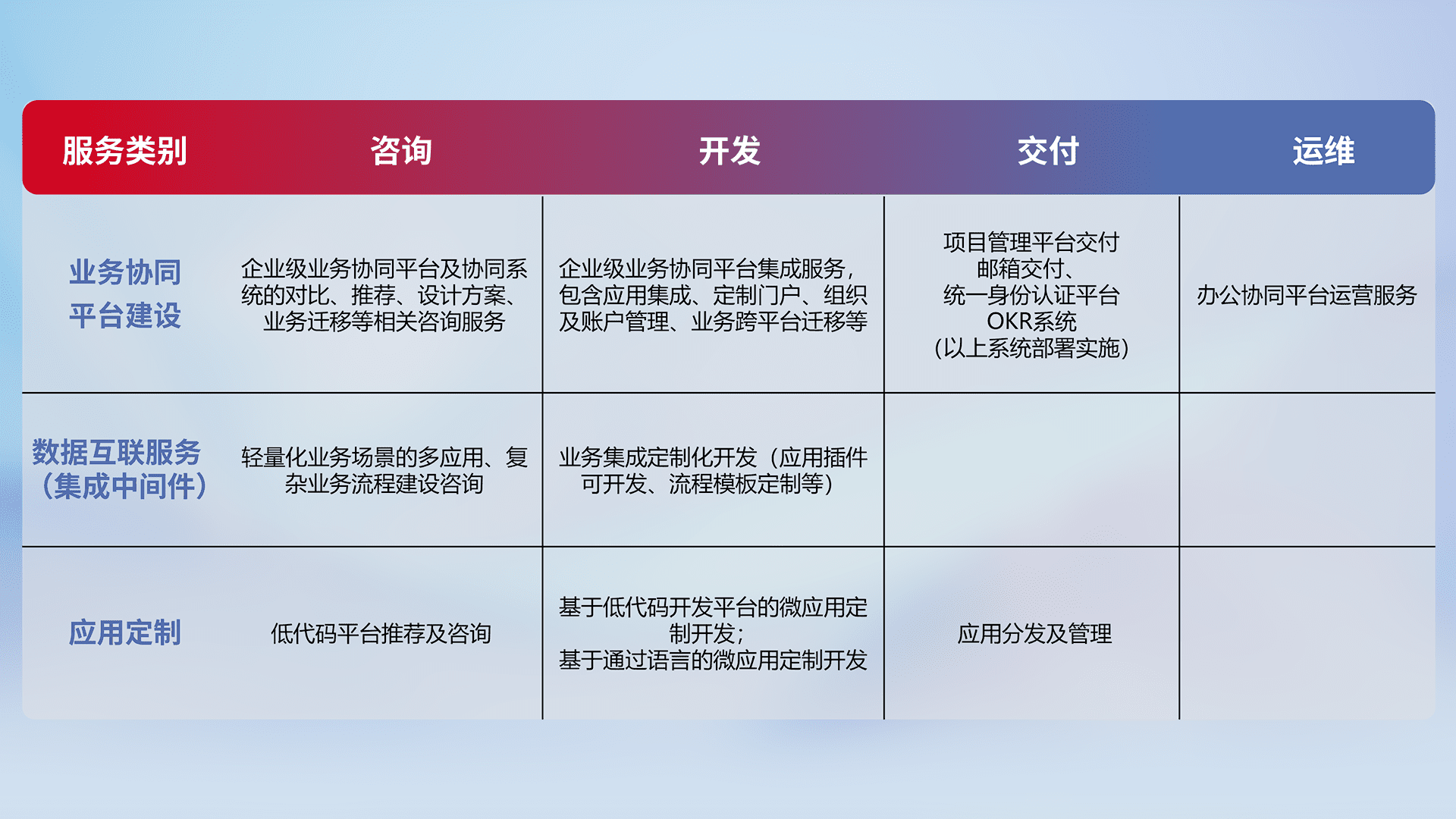 针对钉钉、、企微、、、、IDaas等平台级产品提供产品的规划、、、、方案、、交付、、定制化开发等服务,,,实现如统一协同办公、、、、智能客户服务、、、、混合会议管理、、、智能数据查询、、、等业务场景,,实现数字化转型。。